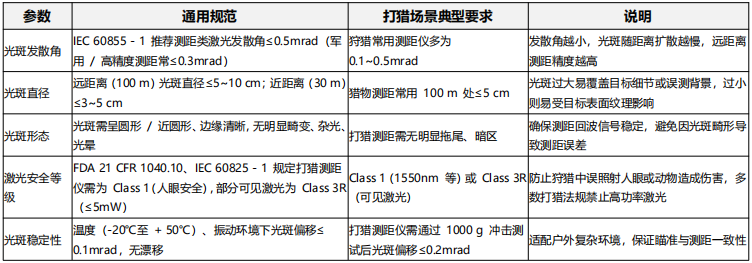国际上枪瞄打猎用激光测距的光斑要求,核心聚焦于光斑尺寸与发散角、光斑形态与稳定性、眼安全合规、测距精度匹 配四大维度,且多遵循国际电工委员会(IEC)、美国 FDA 等机构的通用标准,无独立的打猎专属光斑强制标准,以下是具 体要求与常见规范: