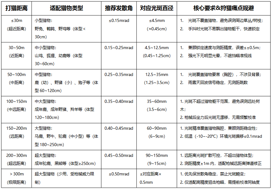 核心依据:光斑直径=发散角(mrad)×距离(m),适配狩猎常见猎物+合规要求,兼顾测距精准度与目标锁定效率,均符合 IEC 60855-1、FDA 安全规范。